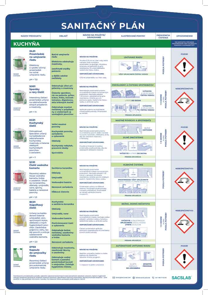 Detailne vypracované Sanitačné plány a Postupy čistenia vo forme praktických nástenných plagátov. Každý dokument je prehľadne graficky spracovaný na odolnom plastifikovanom obale, ktorý zaručuje dlhodobú životnosť aj v náročnom prevádzkovom prostredí.